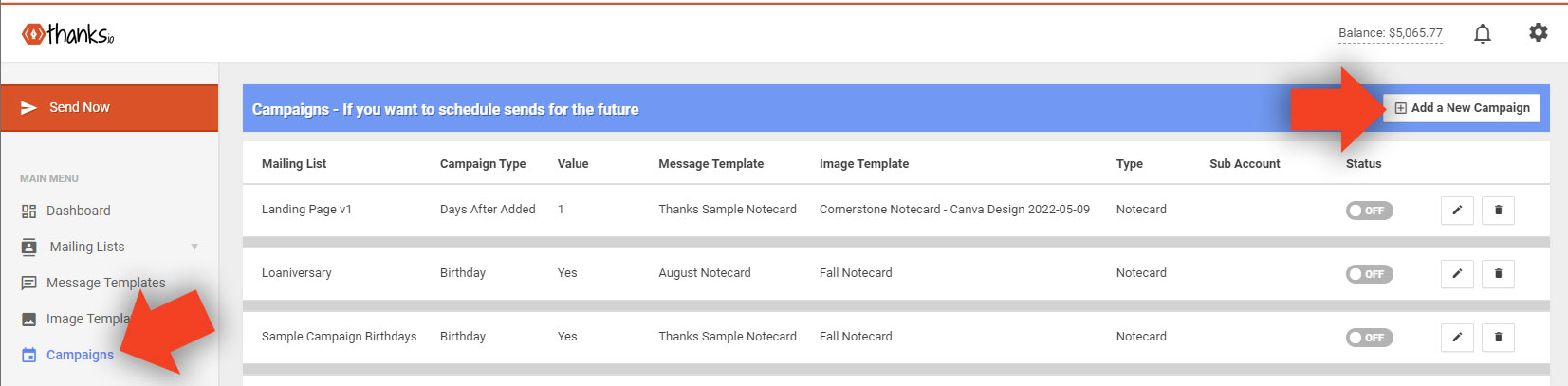 Once you are able to add contacts from monday.com to a thanks.io mailing list via sync, you now need to setup a Campaign in thanks.io which will automatically send your mail after such a recipient is added.