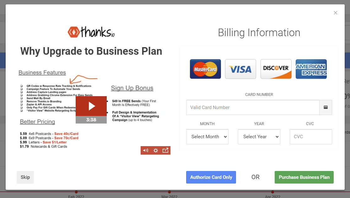 When creating an account you'll see the following modal . Enter your credit card and purchase the business plan at $50/mo (cancel anytime.)