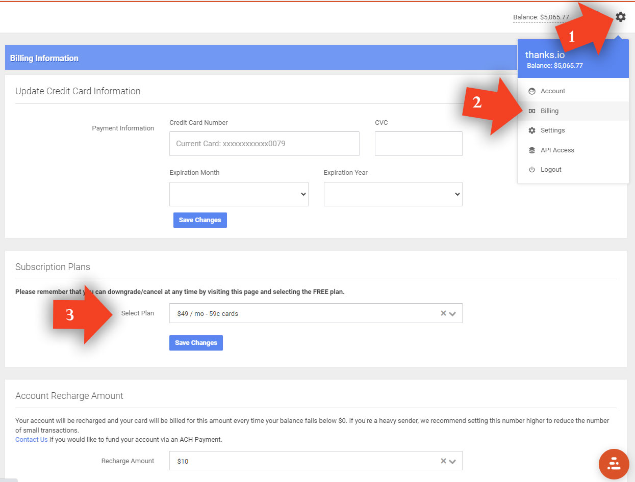 Alternatively, click on the 'gear' icon at the top right of the dashboard, and select 'Billing' from the drop down menu to change your subscription settings. Don't forget to save changes.
