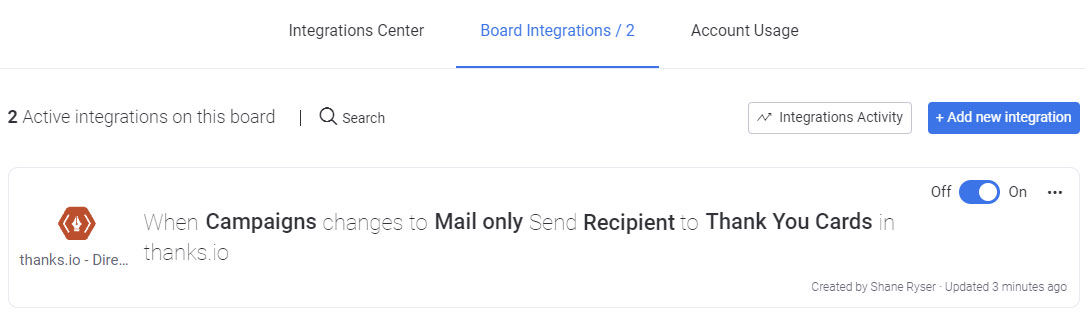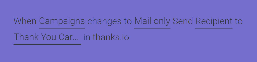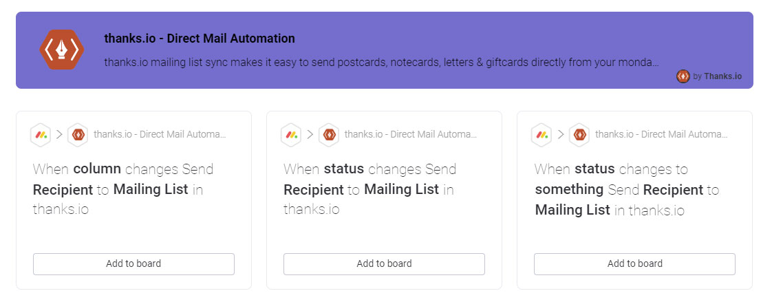 In this example, I created a status in my board for 'Campaign Type.' When I select the 'Mail Only' status, we'll add that contact to my 'Thank You Cards' mailing list in thanks.io.