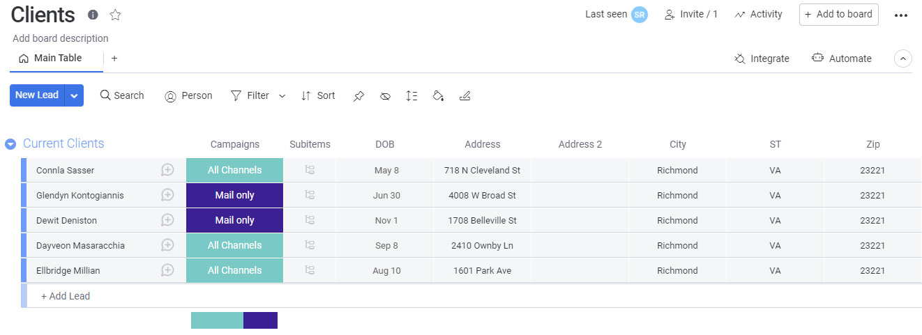 You should have a contacts board setup in monday.com that has all of the data you need (At least name and mailing address.)