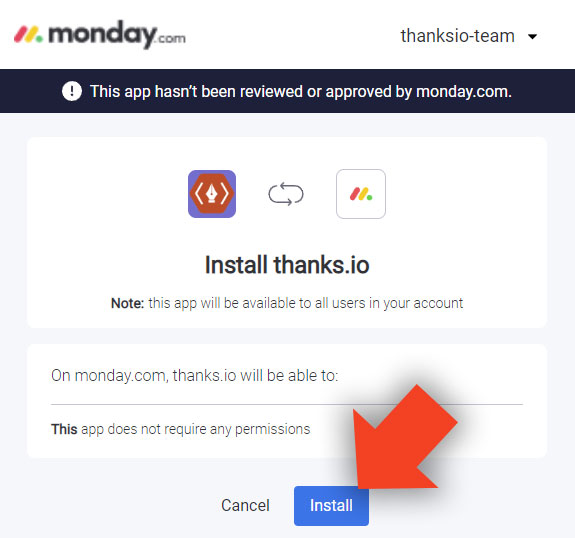 This will open monday.com and prompt you to allow the installation of thanks.io. Click Install.