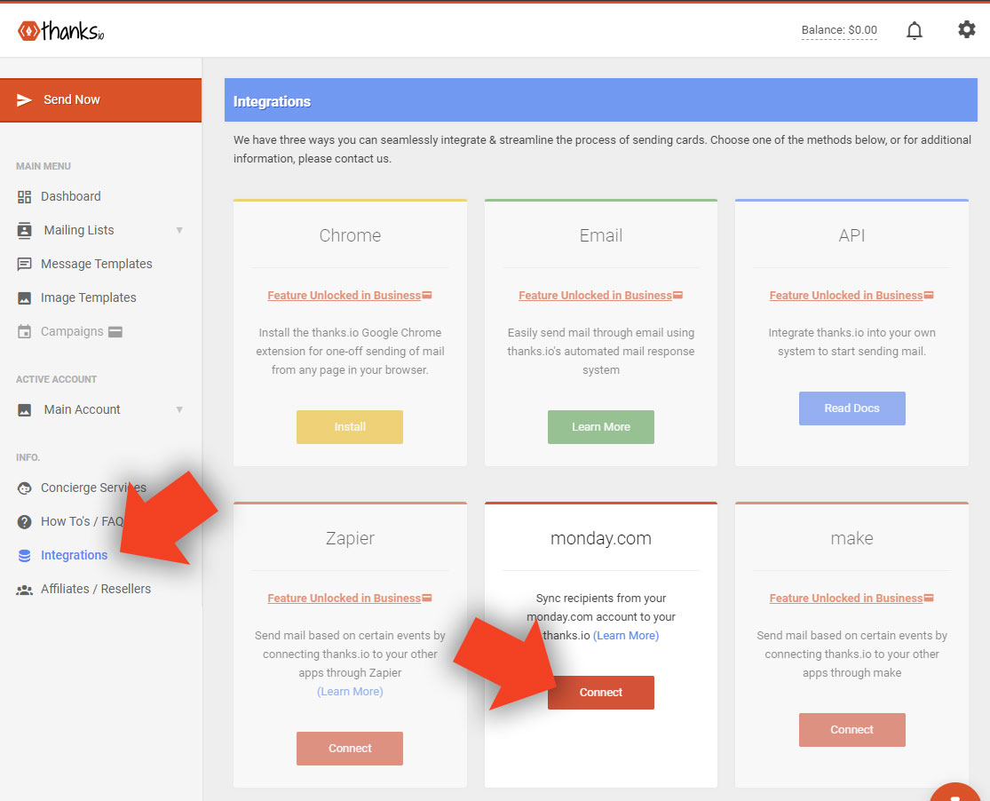 In the left hand navigation, click on 'Integrations.' Then, find the monday.com tile.